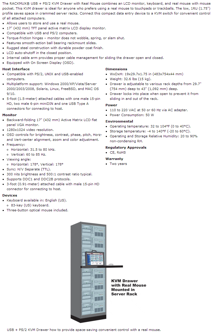Rackmount VGA USB + PS/2 KVM Drawer with Real Mouse