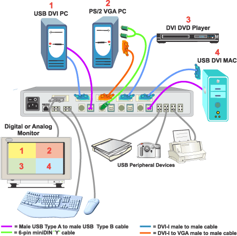 USB DVI KVM switch built-in quad splitter